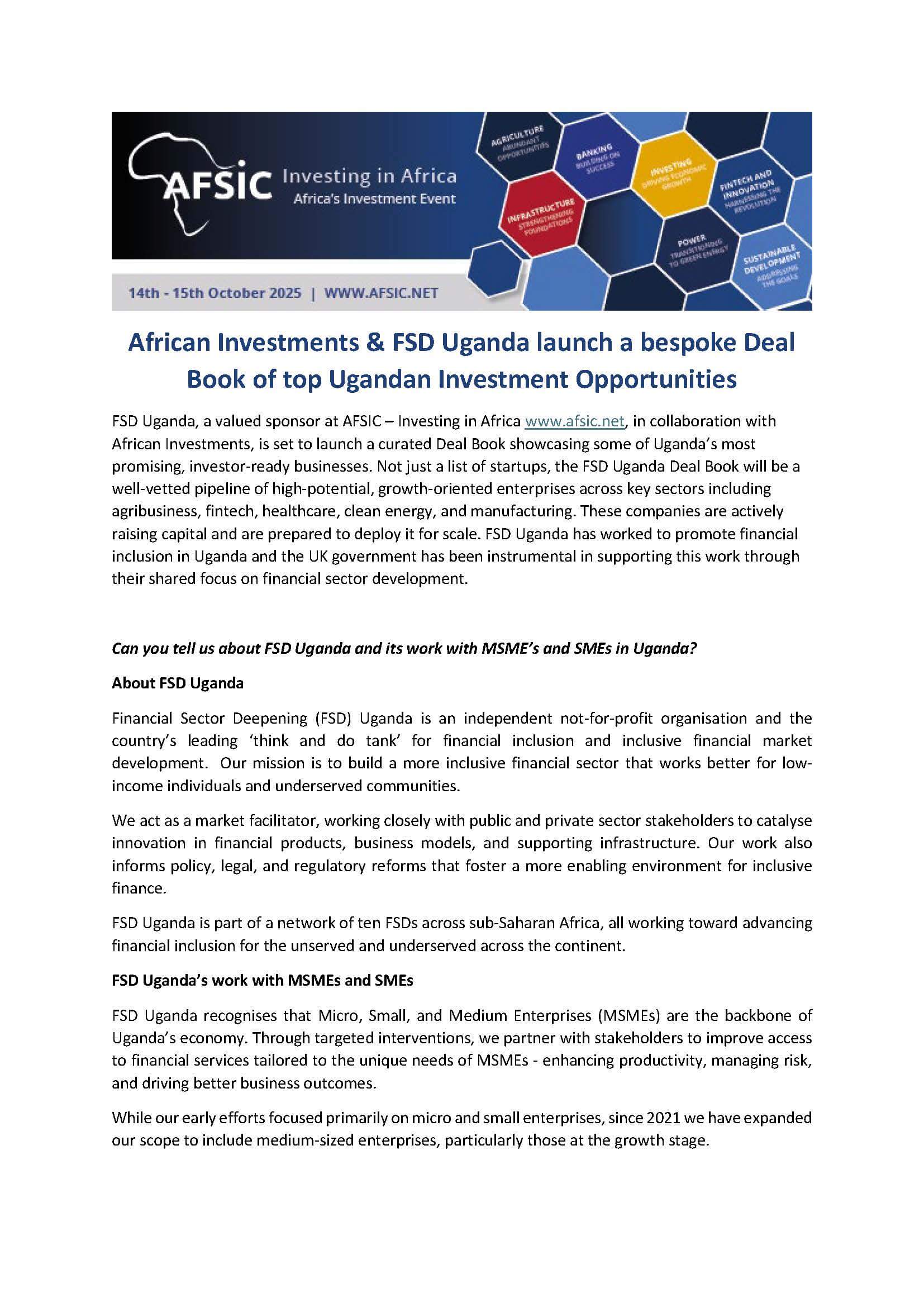 African Investments & FSD Uganda launch a bespoke Deal Book of top Ugandan Investment Opportunities